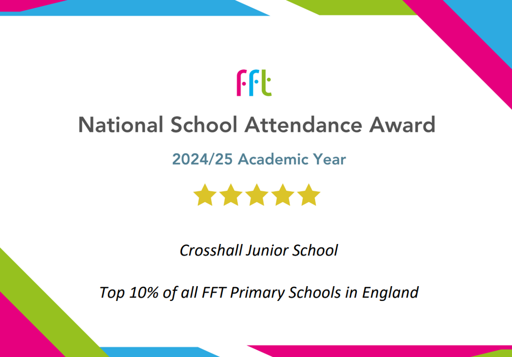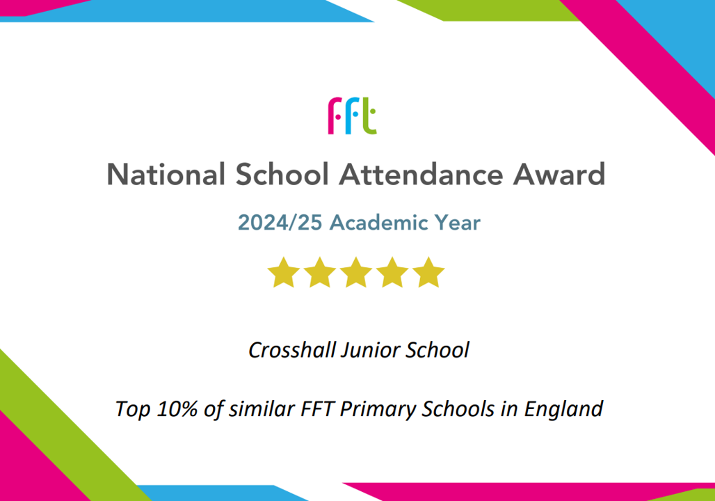 Whilst all schools do an amazing job to improve pupil attendance, FFT recognise and send special ‘thank-you’ to Crosshall Junior School by presenting us with an FFT National School Attendance Award. Well done to our CJS community!